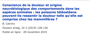 1/ Conscience de la douleur et origine neurobiologique des comportements dans les espèces animales: les poissons téléostéens peuvent-ils ressentir la douleur telle qu’elle est comprise chez les mammifères ?B. Calvino. Professeur honoraire de neurophysiologieDouleur analg. (2019) 32:128-136