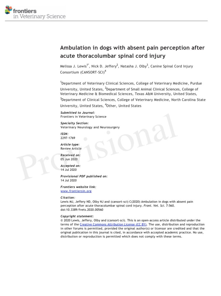 Résumé : Acute thoracolumbar spinal cord injury (SCI) is common in dogs frequently secondary to intervertebral disc herniation. Following severe injury, some dogs never regain sensory function to the pelvic limbs or tail and are designated chronically ‘deep pain negative.’ Despite this, a subset of these dogs develop spontaneous motor recovery over time including some that recover sufficient function in their pelvic limbs to walk independently without assistance or weight support. This type of ambulation is commonly known as ‘spinal walking’ and can take up to a year or more to develop. This review provides a comparative overview of locomotion and explores the physiology of locomotor recovery after severe SCI in dogs. We discuss the mechanisms by which post-injury plasticity and coordination between circuitry contained within the spinal cord, peripheral sensory feedback, and residual or recovered supraspinal connections might combine to underpin spinal walking. The clinical characteristics of spinal walking are outlined including what is known about the role of patient or injury features such as lesion location, timeframe post-injury, body size and spasticity. The relationship between the emergence of spinal walking and electrodiagnostic and magnetic resonance imaging findings are also discussed. Finally, we review possible ways to predict or facilitate recovery of walking in chronically deep pain negative dogs. Improved understanding of the mechanisms of gait generation and plasticity of the surviving tissue after injury might pave the way for further treatment options and enhanced outcomes in severely injured dogs.
