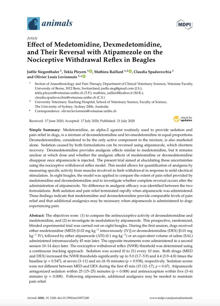 Medetomidine, an alpha-2 agonist routinely used to provide sedation and pain relief in dogs, is a mixture of dexmedetomidine and levomedetomidine in equal proportions.Dexmedetomidine, considered to be the only active component in the mixture, is also marketed alone. Sedation caused by both formulations can be reversed using atipamezole, which shortens recovery.Dexmedetomidine provides analgesic effects similar to medetomidine, but it remains unclear at which dose and whether the analgesic effects of medetomidine or dexmedetomidine disappear once atipamezole is injected. The present trial aimed at elucidating these uncertainties using the nociceptive withdrawal reflex model. This model allows for quantification of analgesia by measuring specific activity from muscles involved in limb withdrawal in response to mild electrical stimulation. In eight beagles, the model was applied to compare the extent of pain relief provided by medetomidine and dexmedetomidine and to investigate whether complete reversal occurs after the administration of atipamezole. No difference in analgesic efficacy was identified between the two formulations. Both sedation and pain relief terminated rapidly when atipamezole was administered.