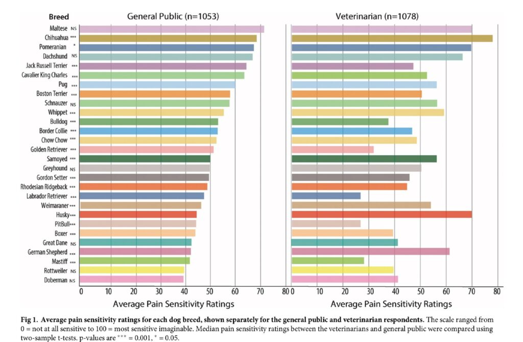 Bien qu’il n’y ait actuellement aucune base physiologique connue pour de telles différences entre les races, plus de 90% des répondants des deux groupes ont indiqué croire en des différences de sensibilité et de réaction à la douleur entre les races de chiens. Cependant, ces différences de sensibilité à la douleur n’ont pas toujours été ressenties de la même manière entre le grand publique et les vétérinaires.