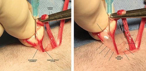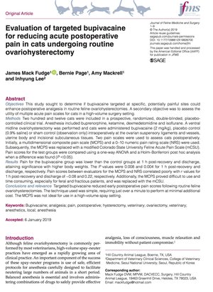2/ Evaluation of targeted bupivacaine for reducing acute postoperative pain in cats undergoing routine ovariohysterectomyFudge JM, Page B, Mackrell A, Lee I.J Feline Med Surg, 2019 Feb 5Résumé : This study sought to determine if bupivacaine targeted at specific, potentially painful sites could enhance postoperative analgesia in routine feline ovariohysterectomies. A secondary objective was to assess the utility of multiple acute pain scales for cats in a high-volume surgery setting. Methods: Two hundred and twelve cats were included in a prospective, randomized, double-blinded, placebo-controlled clinical trial. Anesthesia included buprenorphine, ketamine, dexmedetomidine and isoflurane. A ventral midline ovariohysterectomy was performed and cats were administered bupivacaine (2 mg/kg), placebo control (0.9% saline) or sham control (observation only) intraoperatively at the ovarian suspensory ligaments and vessels, uterine body and incisional subcutaneous tissues. Two pain scales were used to assess cats postoperatively. Initially, a multidimensional composite pain scale (MCPS) and a 0–10 numeric pain rating scale (NRS) were used. Subsequently, the MCPS was replaced with a modified Colorado State University Feline Acute Pain Scale (mCSU). Pain scores for the test groups were compared using a one-way ANOVA and a Holm–Bonferroni post hoc analysis when a difference was found (P <0.05). Results: Pain for the bupivacaine group was lower than the control groups at 1 h post-recovery and discharge, attaining significance with higher body weights. The P values were 0.008 and 0.004 for 1 h post-recovery and discharge, respectively. Pain scores between evaluators for the MCPS and NRS correlated poorly with r values for 1 h post-recovery and discharge of −0.08 and 0.22, respectively. Additionally, the MCPS proved difficult to use and time consuming, especially for feral and fractious patients, and was replaced with the mCSU. Conclusions and relevance: Targeted bupivacaine reduced early postoperative pain scores following routine feline ovariohysterectomies. The technique used was simple, requiring just over a minute to perform at minimal additional cost. The MCPS was not ideal for use in a high-volume spay setting.