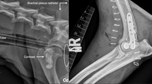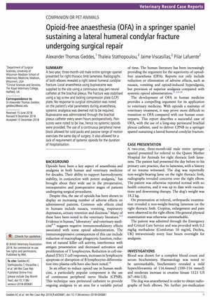 1/ Opioid-free anaesthesia (OFA) in a springer spaniel sustaining a lateral humeral condylar fracture undergoing surgical repairGeddes, AT., Stathopoulou, T., Viscasillas, J., Lafuente, P.Veterinary Record Case Reports, 2019, 7: e000681.Résumé : A two-year, three-month-old male entire springer spaniel presented for right thoracic limb lameness. Radiographs of both elbows revealed a right lateral humeral condylar fracture. Local anaesthesia using bupivacaine was supplied to the site using a continuous stay peri-neural catheter at the brachial plexus. The fracture was stabilised using a lag screw and locking compression plate (LCP) plate. No response to surgical stimulation was noted on the patient’s vital parameters during anaesthesia, systemic analgesia was deemed not to be required. Bupivacaine was administered through the brachial plexus catheter every seven hours postoperatively. Pain scores were noted to be low, hence no systemic opioids were provided. The use of a continuous peripheral nerve block allowed for cold packs and passive range of motion exercises the same day of surgery. It also allowed for a lack of requirement of systemic opioids for the duration of hospitalisation.