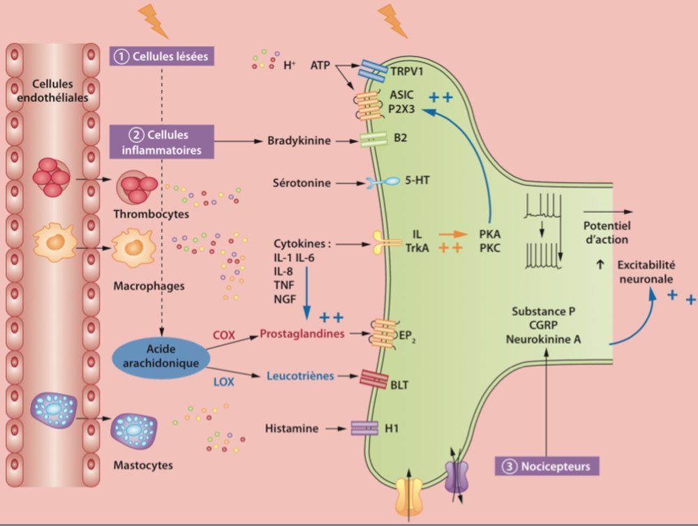La douleur nociceptive aiguë résulte de la mise en jeu d’une triade :Lésion-inflammation-douleur.Les informations nociceptives à l’origine de la douleur aiguë sont générées à la périphérie par la lésion qui va être à l’origine d’une inflammation : de nombreuses molécules, constituant la « soupe inflammatoire », sont synthétisées et libérées par les cellules lésées des tissus périphériques, les terminaisons nerveuses et les cellules immunocompétentes activées qui migrent dans le foyer inflammatoire et sont à l’origine de la composante inflammatoire de la douleur.Ces molécules sont susceptibles d’activer et/ou de sensibiliser les nocicepteurs périphériques, du fait que leurs récepteurs sont exprimés par les terminaisons nerveuses des fibres périphériques nociceptives de petit diamètre des nerfs sensoriels (dans lesquels on trouve aussi les fibres non nociceptives de la sensibilité tactile légère de gros diamètre).Ces fibres sont les axones des neurones sensoriels primaires dont le corps cellulaire est localisé dans le ganglion de la racine dorsale (GRD)