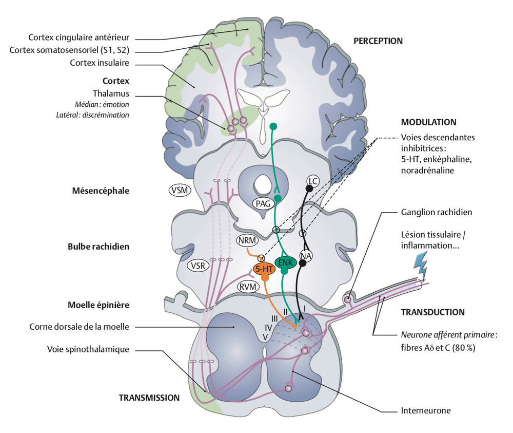 La complexité de la compréhension des bases neurophysiologiques de la douleur vient en grande partie de la multiplicité des voies ascendantes localisées dans la moelle épinière, des nombreuses structures de projection du tronc cérébral et de l’encéphale qui contribuent toutes à la genèse de la douleur et à sa modulation qui résulte de la mise en jeu de contrôles exercés par des structures spinales et supra-spinales.