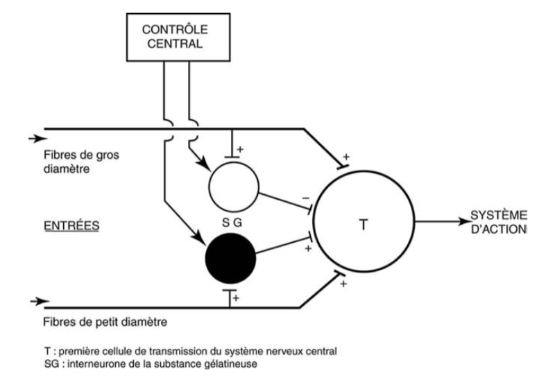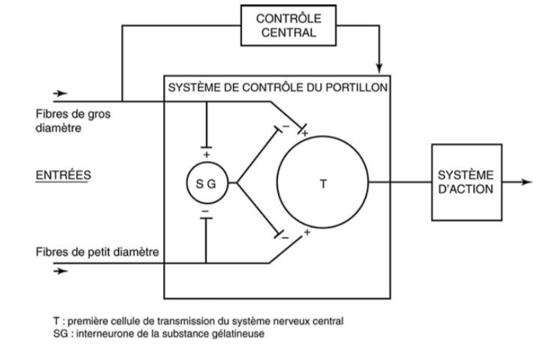 La douleur n’est ressentie que lorsque la balance penche en faveur des activités excitatrices.L’activation des fibres non nociceptives fermerait le portillon et bloquerait la transmission de l’information nociceptive vers les structures de la douleur dans l’encéphale (idée associée à une analgésie) ; l’activation des fibres nociceptives ouvrirait le portillon et favoriserait la transmission de l’information nociceptive vers les structures de la douleur dans l’encéphale (idée associée à la sensation de douleur).
