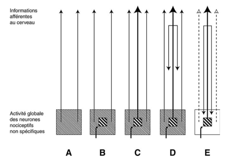 Les contrôles inhibiteurs diffus induits par une stimulation nociceptive (CIDN) Les contrôles inhibiteurs diffus induits par une stimulation nociceptive (CIDN) constituent le support neurophysiologique de la contre-irritation, qui résulte des effets réciproques entre deux stimulations nociceptives d’intensités différentes, processus par lequel une douleur peut masquer une autre douleur.Ces CIDN peuvent être déclenchés par une stimulation depuis n’importe quel territoire corporel (stimulation hétérotopique) distinct des territoires activés par la douleur, y compris à partir d’un territoire viscéral, à la condition que cette stimulation hétérotopique soit douloureuse.Cette vieille pratique clinique était utilisée il y a encore peu de temps (ex. : cataplasmes sinapisés) et, relevant du même principe de contre-irritation, des techniques d’hyperstimulation (ex. : électro-acupuncture) sont aussi utilisées pour obtenir des analgésies, d’autant plus efficaces qu’elles sont d’une intensité à la limite de la tolérance de la douleur du sujet.Interprétation hypothétique de l’activité globale des neurones spinaux et trigéminaux liés à la nociception.A : l’ensemble de cette activité pourrait ne pas être négligeable chez les sujets en action, donnant lieu à une « activité somesthésique de base » transmise vers les centres nerveux supérieurs.B : un stimulus nociceptif active les neurones nociceptifs spécifiques et non spécifiques.C : ceux-ci vont envoyer un message excitateur au cerveau.D : ce message déclenche secondairement les CIDN.E : il en résulte une réduction importante de l’activité des neurones convergents non directement concernés par le stimulus initial.