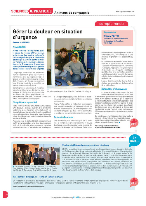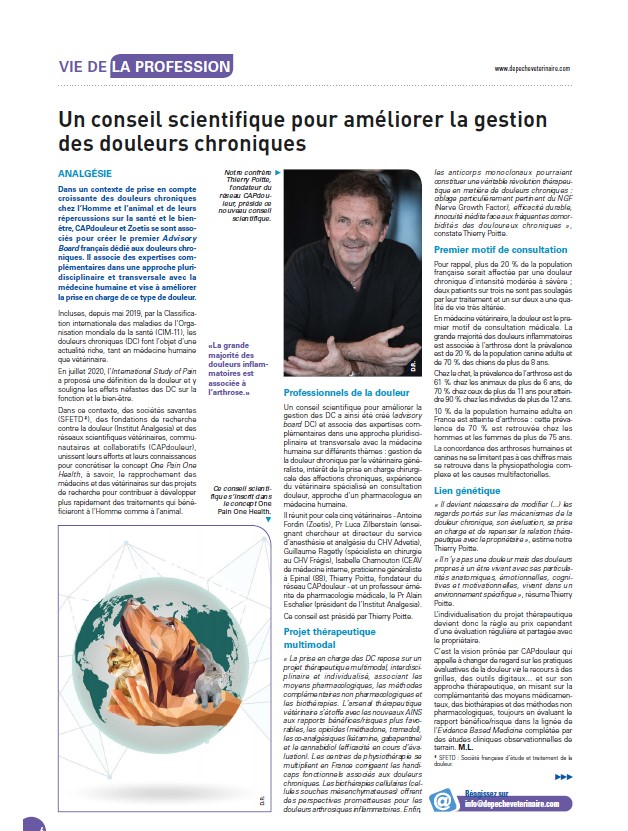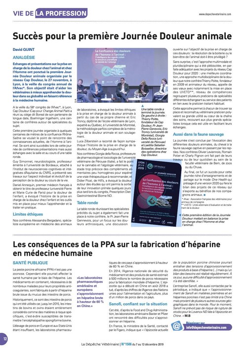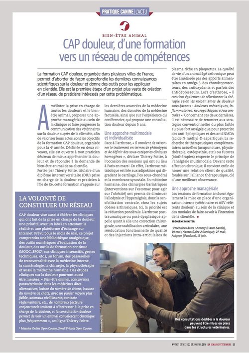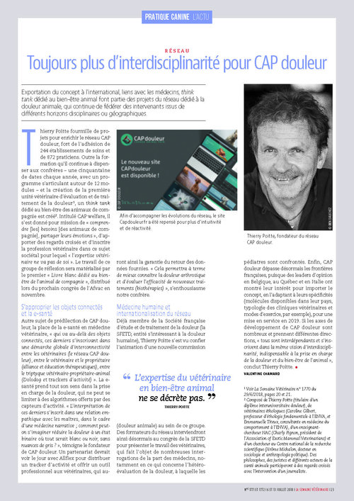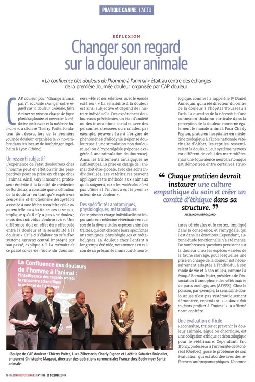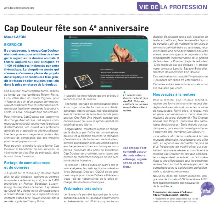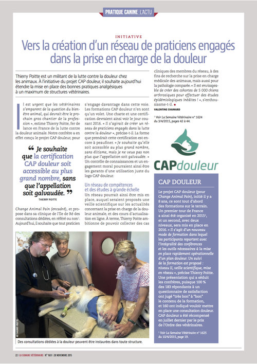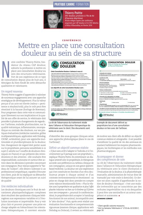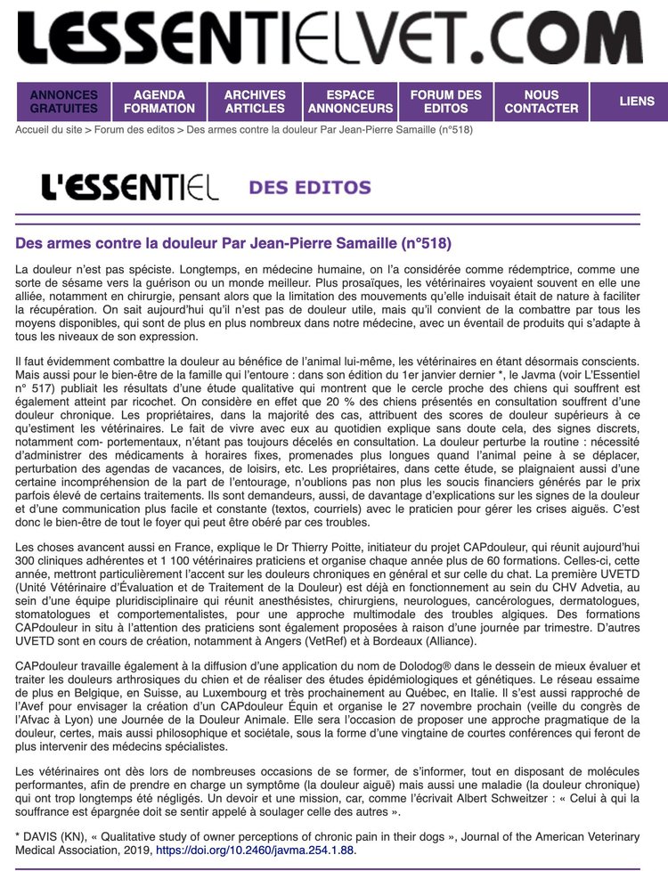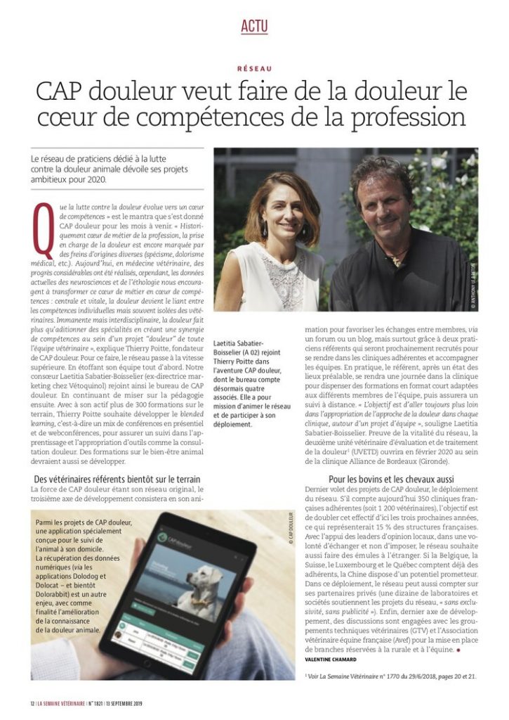 PRESSE Les Médias et la presse vétérinaire parlent de nous. CAPdouleur fête son 4e anniversaire La Dépêche Vétérinaire / 30 Mai 2020 VOIR LE PDF CAPdouleur fête son 4e anniversaire La Dépêche Vétérinaire / 30 Mai 2020 VOIR LE PDF Actualités CAPdouleur et Télémédecine La Semaine Vétérinaire n°1849 10-17 avril 2020 VOIR LE PDF Actualités CAPdouleur et Télémédecine La Dépêche Vétérinaire / 4 avril 2020 La Dépêche Vétérinaire / 4 avril 2020 VOIR LE PDF Actualités CAPdouleur et Télémédecine La Dépêche Vétérinaire / 15 mai 202 VOIR LE PDF La Dépêche Vétérinaire / 29 février 2020 VOIR LE PDF La Semaine Vétérinaire n°1846 / 20 mars 2020 VOIR LE PDF Edité par des journalistes expérimentés, The Conversation est un média indépendant en ligne et sans but lucratif, qui propose du contenu provenant de la communauté universitaire. The Conversation publie un entretien entre le professeur Nicolas Authier, médecin psychiatre et pharmacologue, et le docteur Thierry Poitte, docteur vétérinaire et fondateur du réseau CAP Douleur qui rassemble et forme des vétérinaires intéressés par les sujets de la Douleur et du Bien-être animal. La Semaine Vétérinaire n°1846 / 20 mars 2020 VOIR L'ARTICLE Dossier Douleur animale dans la Revue Douleur et Analgésie de la Société Française d'Etude et de Traitement de la Douleur Douleur et AnalgésieVolume 32 / N°3 (Septembre 2019) VOIR L'ARTICLE Conscience de la douleur et origine neurobiologique… VOIR L'ARTICLE Projet douleur en médecine véterinaire VOIR LE PDF 1ère Journée Douleur Boréal / Musée des Confluences et AFVAC Lyon 2019 N° 1835 I 20 Décembre 2019 I La Semaine Vétérinaire I 17 VOIR LE PDF 1ère Journée Douleur Boréal / Musée des Confluences et AFVAC Lyon 2019 La Dépêche Vétérinaire | N°1506 du 7 au 13 décembre 2019 VOIR LE PDF 1ère Journée Douleur Boréal / Musée des Confluences et AFVAC Lyon 2019 N° 1835 I 20 Décembre 2019 I La Semaine Vétérinaire 17 VOIR LE PDF CAPdouleur est sur Europe 1 dans l'émission Planète sauvage de Wendy Bouchard. Retrouvez l’annonce de la 1ère journée consacrée à la confluence des douleurs humaines et animales à Lyon ce mercredi 27 novembre. ECOUTEZ L'EMISSION La Semaine Vétérinaire du 13 septembre 2019 VOIR LE PDF La Dépêche Vétérinaire 28 / Septembre 2019 VOIR LE PDF La Semaine Vétérinaire du 23-30 Août 2019 VOIR LE PDF La Dépêche Vétérinaire 25 Juin 2019 VOIR LE PDF La Semaine Vétérinaire 1er Juin 2019 VOIR LE PDF La Semaine Vétérinaire 1er Juin 2019 VOIR LE PDF La Semaine Vétérinaire 8 Juin 2019 VOIR LE PDF La Semaine Vétérinaire 21 Juin 2019 VOIR LE PDF La Semaine Vétérinaire / 22 Mars 2019 VOIR LE PDF L’Essentiel N°543 14-20 Novembre 2019 VOIR LE PDF La Semaine Vétérinaire / N° 1804 / 12 avril 2019 VOIR LE PDF La Semaine Vétérinaire / N° 1787 / 30 Novembre 2018 VOIR LE PDF La Semaine Vétérinaire / N° 1802 / 29 Mars 2019 VOIR LE PDF La Semaine Vétérinaire / N° 1792 / 18 Janvier 2019 I VOIR LE PDF La Semaine Vétérinaire / N°1787 / 30 Novembre 2018 I VOIR LE PDF L’Essentiel Mai 2019 VOIR LE PDF La Dépêche Vétérinaire / 7-13 Juillet 2018 VOIR LE PDF La Semaine Vétérinaire / N°1771 et 1772 / 6-13 Juillet 2018 VOIR LE PDF Le Point Vétérinaire / Octobre 2018 / n°389 VOIR L'ARTICLE VOIR LE PDF La Semaine Vétérinaire / N° 1770 / 29 Juin 2018 VOIR LE PDF VETOMECUM AVRIL 2018 VOIR LE PDF La Dépêche Vétérinaire / 28 Février 2018 VOIR LE PDF La Dépêche Vétérinaire / 10 Février 2018 VOIR LE PDF La Semaine Vétérinaire N° 1741 / 24 Novembre 2017 VOIR LE PDF PAINJOURNALONLINE.COM / VOLUME 158 / N°9 / Septembre 2017 VOIR LE PDF La Semaine Vétérinaire N°1722 / 2 Juin 2017 VOIR LE PDF La Dépêche Vétérinaire / DU 18 AU 24 Mars VOIR LE PDF La Dépêche Vétérinaire / 4 Février 2017 VOIR LE PDF France Inter parle de nous. FRANCE INTER / ÉMISSION DE RADIO – Mars 2017 https://preprod.capdouleur.fr/app/uploads/2020/06/BDCAPdouleur.mp3 La Semaine Vétérinaire / 6 Janvier 2017 VOIR LE PDF La Semaine Vétérinaire / 9 Décembre 2016 VOIR LE PDF L’Essentiel / 29 Septembre 2016 VOIR LE PDF L’Essentiel / 29 Septembre 2016 VOIR LE PDF La Dépêche Vétérinaire / 1ER Juillet 2016 VOIR LE PDF L’Essentiel / 19 Mai 2016 VOIR LE PDF La Dépêche Vétérinaire / 30 Avril 2016 VOIR LE PDF La Semaine Vétérinaire / 20 Mai 2016 VOIR LE PDF La Semaine Vétérinaire / 18 Mars 2016 VOIR LE PDF La Semaine Vétérinaire / 29 Avril 2016 VOIR LE PDF La Semaine Vétérinaire 20 Novembre 2015 VOIR LE PDF Vous souhaitez en savoir plus sur CAPdouleur ? Contactez-nous Laëtitia BoisselierDMV, Directrice des opérations +33 (0)6 61 21 77 27laetitia.boisselier@capdouleur.fr Lydie MartinResponsable Relation Adhérents et formation ASV +33 (0)6 17 24 43 35lydie.martin@capdouleur.fr www.capdouleur.fr Suivez-nous Facebook Linkedin Se faire appeler Nom Prénom E-mail Téléphone Heure de rappel Envoyer Découvrez les cliniques du réseau et les témoignages de nos adhérents Découvrir Découvrez les services que propose CAPdouleur Nos services Choisissez la formule qui vous convient : Nos formules
