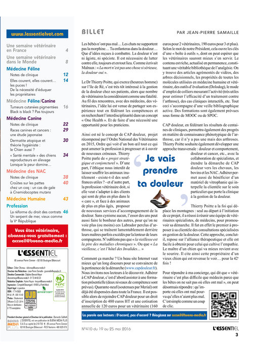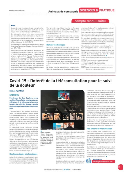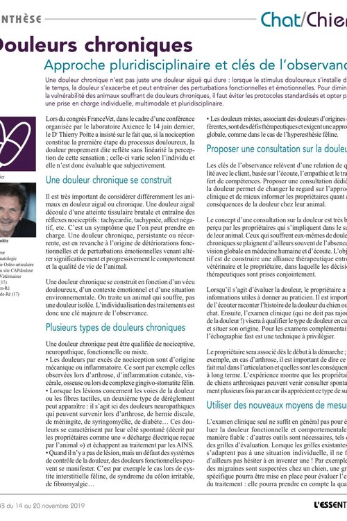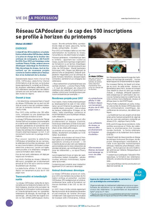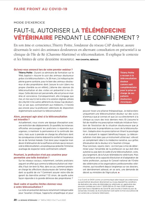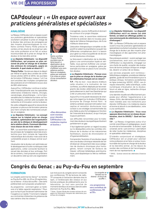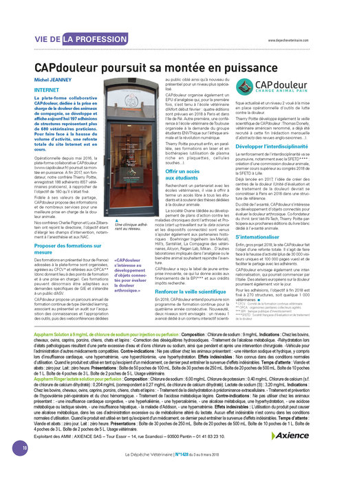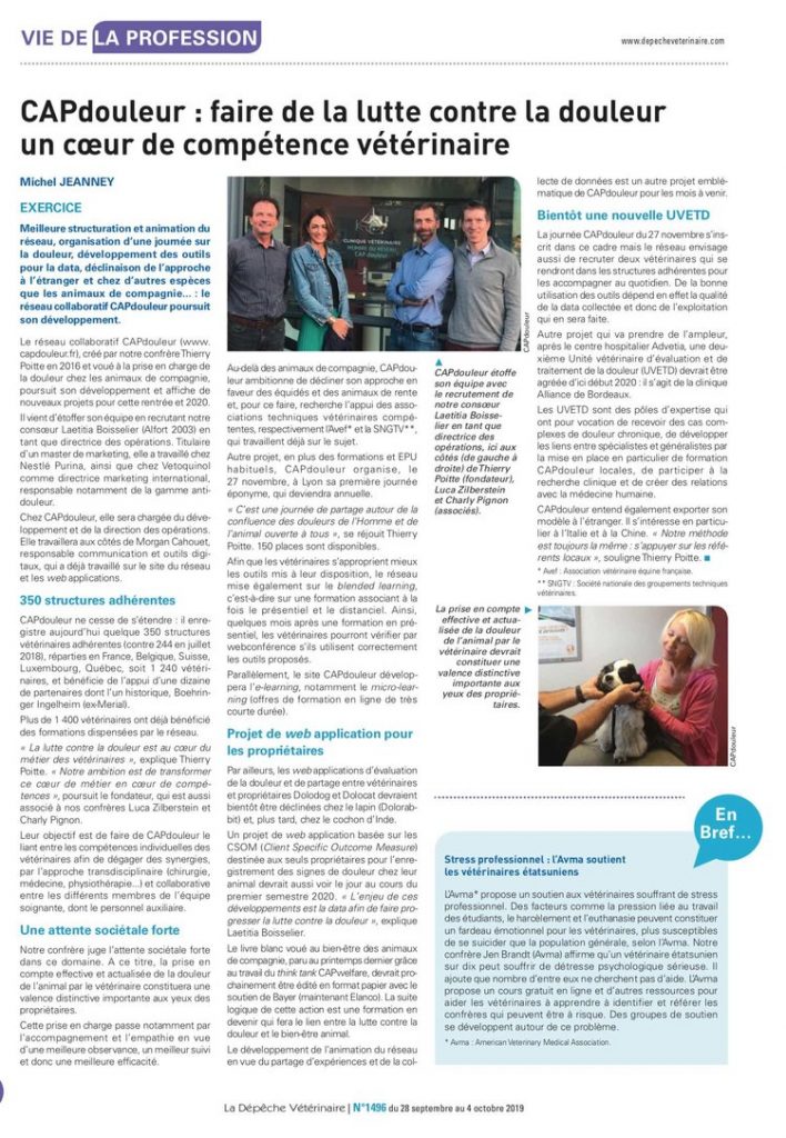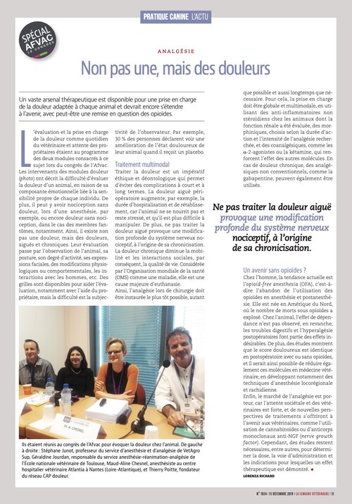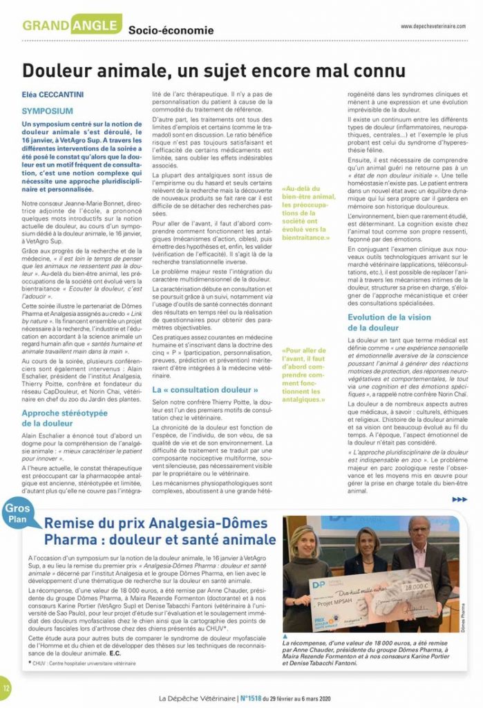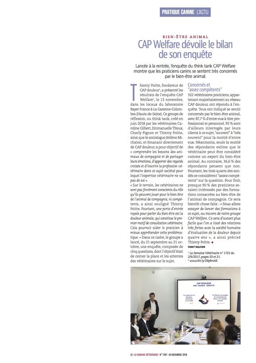 PRESSE Les Médias et la presse vétérinaire parlent de nous. CAPdouleur fête son 4e anniversaire La Dépêche Vétérinaire / 30 Mai 2020 VOIR LE PDF CAPdouleur fête son 4e anniversaire La Dépêche Vétérinaire / 30 Mai 2020 VOIR LE PDF Actualités CAPdouleur et Télémédecine La Semaine Vétérinaire n°1849 10-17 avril 2020 VOIR LE PDF Actualités CAPdouleur et Télémédecine La Dépêche Vétérinaire / 4 avril 2020 La Dépêche Vétérinaire / 4 avril 2020 VOIR LE PDF Actualités CAPdouleur et Télémédecine La Dépêche Vétérinaire / 15 mai 202 VOIR LE PDF La Dépêche Vétérinaire / 29 février 2020 VOIR LE PDF La Semaine Vétérinaire n°1846 / 20 mars 2020 VOIR LE PDF Edité par des journalistes expérimentés, The Conversation est un média indépendant en ligne et sans but lucratif, qui propose du contenu provenant de la communauté universitaire. The Conversation publie un entretien entre le professeur Nicolas Authier, médecin psychiatre et pharmacologue, et le docteur Thierry Poitte, docteur vétérinaire et fondateur du réseau CAP Douleur qui rassemble et forme des vétérinaires intéressés par les sujets de la Douleur et du Bien-être animal. La Semaine Vétérinaire n°1846 / 20 mars 2020 VOIR L'ARTICLE Dossier Douleur animale dans la Revue Douleur et Analgésie de la Société Française d'Etude et de Traitement de la Douleur Douleur et AnalgésieVolume 32 / N°3 (Septembre 2019) VOIR L'ARTICLE Conscience de la douleur et origine neurobiologique… VOIR L'ARTICLE Projet douleur en médecine véterinaire VOIR LE PDF 1ère Journée Douleur Boréal / Musée des Confluences et AFVAC Lyon 2019 N° 1835 I 20 Décembre 2019 I La Semaine Vétérinaire I 17 VOIR LE PDF 1ère Journée Douleur Boréal / Musée des Confluences et AFVAC Lyon 2019 La Dépêche Vétérinaire | N°1506 du 7 au 13 décembre 2019 VOIR LE PDF 1ère Journée Douleur Boréal / Musée des Confluences et AFVAC Lyon 2019 N° 1835 I 20 Décembre 2019 I La Semaine Vétérinaire 17 VOIR LE PDF CAPdouleur est sur Europe 1 dans l'émission Planète sauvage de Wendy Bouchard. Retrouvez l’annonce de la 1ère journée consacrée à la confluence des douleurs humaines et animales à Lyon ce mercredi 27 novembre. ECOUTEZ L'EMISSION La Semaine Vétérinaire du 13 septembre 2019 VOIR LE PDF La Dépêche Vétérinaire 28 / Septembre 2019 VOIR LE PDF La Semaine Vétérinaire du 23-30 Août 2019 VOIR LE PDF La Dépêche Vétérinaire 25 Juin 2019 VOIR LE PDF La Semaine Vétérinaire 1er Juin 2019 VOIR LE PDF La Semaine Vétérinaire 1er Juin 2019 VOIR LE PDF La Semaine Vétérinaire 8 Juin 2019 VOIR LE PDF La Semaine Vétérinaire 21 Juin 2019 VOIR LE PDF La Semaine Vétérinaire / 22 Mars 2019 VOIR LE PDF L’Essentiel N°543 14-20 Novembre 2019 VOIR LE PDF La Semaine Vétérinaire / N° 1804 / 12 avril 2019 VOIR LE PDF La Semaine Vétérinaire / N° 1787 / 30 Novembre 2018 VOIR LE PDF La Semaine Vétérinaire / N° 1802 / 29 Mars 2019 VOIR LE PDF La Semaine Vétérinaire / N° 1792 / 18 Janvier 2019 I VOIR LE PDF La Semaine Vétérinaire / N°1787 / 30 Novembre 2018 I VOIR LE PDF L’Essentiel Mai 2019 VOIR LE PDF La Dépêche Vétérinaire / 7-13 Juillet 2018 VOIR LE PDF La Semaine Vétérinaire / N°1771 et 1772 / 6-13 Juillet 2018 VOIR LE PDF Le Point Vétérinaire / Octobre 2018 / n°389 VOIR L'ARTICLE VOIR LE PDF La Semaine Vétérinaire / N° 1770 / 29 Juin 2018 VOIR LE PDF VETOMECUM AVRIL 2018 VOIR LE PDF La Dépêche Vétérinaire / 28 Février 2018 VOIR LE PDF La Dépêche Vétérinaire / 10 Février 2018 VOIR LE PDF La Semaine Vétérinaire N° 1741 / 24 Novembre 2017 VOIR LE PDF PAINJOURNALONLINE.COM / VOLUME 158 / N°9 / Septembre 2017 VOIR LE PDF La Semaine Vétérinaire N°1722 / 2 Juin 2017 VOIR LE PDF La Dépêche Vétérinaire / DU 18 AU 24 Mars VOIR LE PDF La Dépêche Vétérinaire / 4 Février 2017 VOIR LE PDF France Inter parle de nous. FRANCE INTER / ÉMISSION DE RADIO – Mars 2017 https://preprod.capdouleur.fr/app/uploads/2020/06/BDCAPdouleur.mp3 La Semaine Vétérinaire / 6 Janvier 2017 VOIR LE PDF La Semaine Vétérinaire / 9 Décembre 2016 VOIR LE PDF L’Essentiel / 29 Septembre 2016 VOIR LE PDF L’Essentiel / 29 Septembre 2016 VOIR LE PDF La Dépêche Vétérinaire / 1ER Juillet 2016 VOIR LE PDF L’Essentiel / 19 Mai 2016 VOIR LE PDF La Dépêche Vétérinaire / 30 Avril 2016 VOIR LE PDF La Semaine Vétérinaire / 20 Mai 2016 VOIR LE PDF La Semaine Vétérinaire / 18 Mars 2016 VOIR LE PDF La Semaine Vétérinaire / 29 Avril 2016 VOIR LE PDF La Semaine Vétérinaire 20 Novembre 2015 VOIR LE PDF Vous souhaitez en savoir plus sur CAPdouleur ? Contactez-nous Laëtitia BoisselierDMV, Directrice des opérations +33 (0)6 61 21 77 27laetitia.boisselier@capdouleur.fr Lydie MartinResponsable Relation Adhérents et formation ASV +33 (0)6 17 24 43 35lydie.martin@capdouleur.fr www.capdouleur.fr Suivez-nous Facebook Linkedin Se faire appeler Nom Prénom E-mail Téléphone Heure de rappel Envoyer Découvrez les cliniques du réseau et les témoignages de nos adhérents Découvrir Découvrez les services que propose CAPdouleur Nos services Choisissez la formule qui vous convient : Nos formules