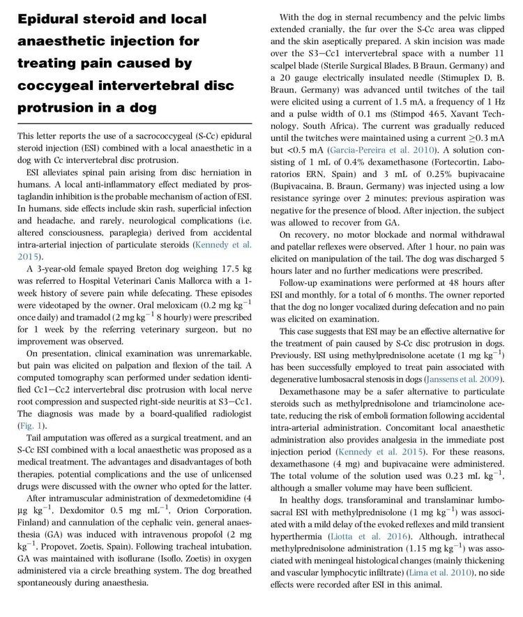1/ Epidural steroid and local anaesthetic injection for treating pain caused by coccygeal intervertebral disc protrusion in a dogAprea Francesco, Vettorato Enzo Vet. Anesth. Analg., In Press, Accepted Manuscript, Available online 8 June 2019Résumé :This letter reports the use of a sacrococcygeal (S-Cc) epidural steroid injection (ESI) combined with a local anaesthetic in a dog with Cc intervertebral disc protrusion. This case suggests that ESI may be an effective alternative for the treatment of pain caused by S-Cc disc protrusion in dogs. Previously, ESI using methylprednisolone acetate (1 mg kg1) has been successfully employed to treat pain associated with degenerative lumbosacral stenosis in dogs (Janssens et al. 2009).